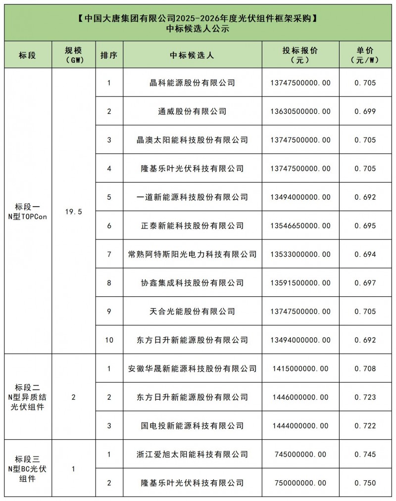 3月5日,大唐集團(tuán)2025-2026年度22.5GW光伏組件框架采購(gòu)中標(biāo)候選人公示。本次項(xiàng)目共分為3個(gè)標(biāo)段,其中標(biāo)段一TOPCon組件單價(jià)為0.692~0.705元/W,Top4組件企業(yè)報(bào)價(jià)均為0.705元/W;標(biāo)段二HJT組件單價(jià)為0.708~0.723元/W,標(biāo)段三BC組件的單價(jià)為0.745元/W、0.75元/W。