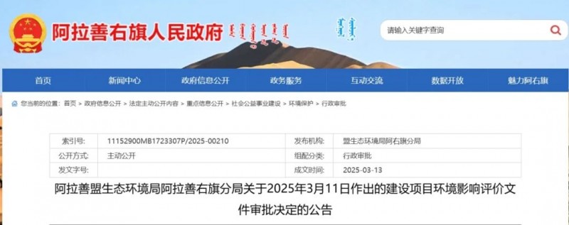 3月13日,內(nèi)蒙古阿拉善右旗人民政府發(fā)布建設(shè)項目環(huán)境影響評價文件審批決定的公告,同意景新塔木素40萬千瓦防沙治沙光伏項目建設(shè)。