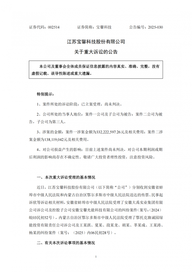 公告顯示,近日寶馨科技分別收到安徽省蚌埠市中級人民法院和內(nèi)蒙古自治區(qū)鄂爾多斯市中級人民法院送達的傳票、民事起訴狀等訴訟相關(guān)材料。