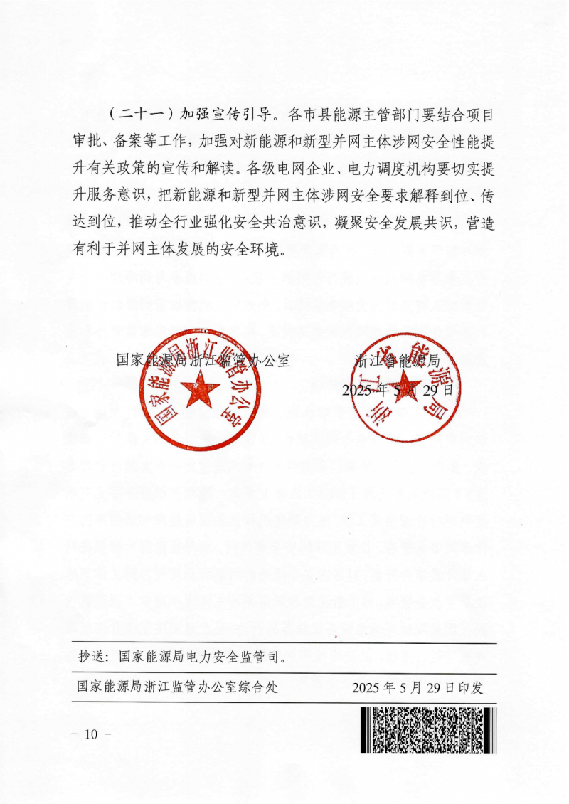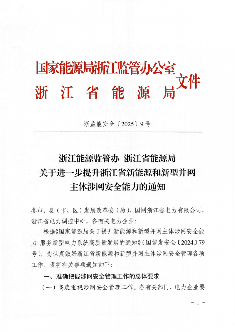 近日,浙江能源監(jiān)管辦 浙江省能源局公布了《關(guān)于進一步提升浙江省新能源和新型并網(wǎng)主體涉網(wǎng)安全能力的通知》。文件圍繞提升涉網(wǎng)安全性能,加強新能源和新型并網(wǎng)主體涉網(wǎng)參數(shù)管理,優(yōu)化并網(wǎng)接入管理,強化并網(wǎng)運行管理,開展存量新能源和新型并網(wǎng)主體涉網(wǎng)性能改造等方面,提出了具體的措施和要求。