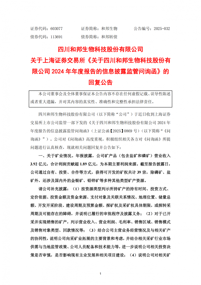 7月9日,四川和邦生物科技股份有限公司(和邦生物)發(fā)布關(guān)于上海證券交易所《關(guān)于四川和邦生物科技股份有限公司2024年年度報(bào)告的信息披露監(jiān)管問(wèn)詢(xún)函》的回復(fù)公告。