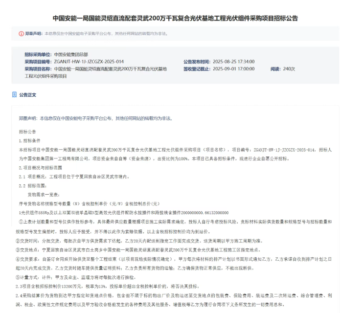 然而,政策倡議與現(xiàn)實(shí)執(zhí)行之間仍存在明顯落差。8月25日,中國(guó)安能發(fā)布200MW光伏組件集采公告,明確限價(jià)0.66元/W(含稅到站價(jià)),低于行業(yè)倡議底線。該項(xiàng)目要求使用N型高效雙面雙玻組件,技術(shù)門(mén)檻不低,但價(jià)格壓制依然嚴(yán)厲。由此,也引發(fā)了市場(chǎng)對(duì)“反內(nèi)卷”政策執(zhí)行力的質(zhì)疑。