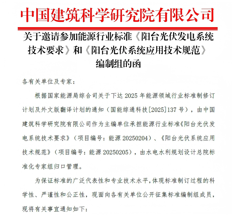 而在今年7月,國家能源局綜合司下發(fā)的《關(guān)于公開征求2025年能源領(lǐng)域擬立項行業(yè)標(biāo)準(zhǔn)制修訂計劃及外文版翻譯計劃意見的通知》中表明,陽臺光伏領(lǐng)域確將出臺新標(biāo)準(zhǔn),管理機(jī)構(gòu)為水電水利規(guī)劃設(shè)計總院,完成年限為2027年。