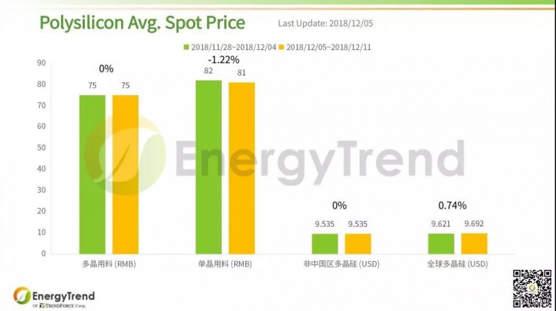 根據(jù)12月5日最新數(shù)據(jù),大陸多晶用硅料最新均價為 RMB75/KG,與上周持平;單晶硅料從 RMB82/KG 去到 RMB81/KG,下跌1.22%。非中國區(qū)多晶硅料均價維持在 US$9.535/KG 不變;而全球多晶硅料則從 US$9.621/KG 上漲至 US$9.692/KG,漲幅為 0.74%。