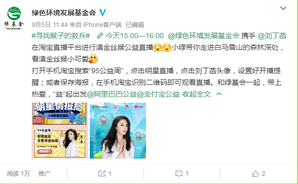 綠基會(huì)官方微博共發(fā)布滇金絲猴保護(hù)及95公益周相關(guān)信息6條,累計(jì)閱讀量46016次;9月5日當(dāng)天綠基會(huì)攜手明星劉丁菡,在淘寶平臺(tái)進(jìn)行“云看猴”滇金絲猴公益直播,呼吁網(wǎng)友觀看公益直播,參與95公益周活動(dòng),為滇金絲猴保護(hù)助力。
