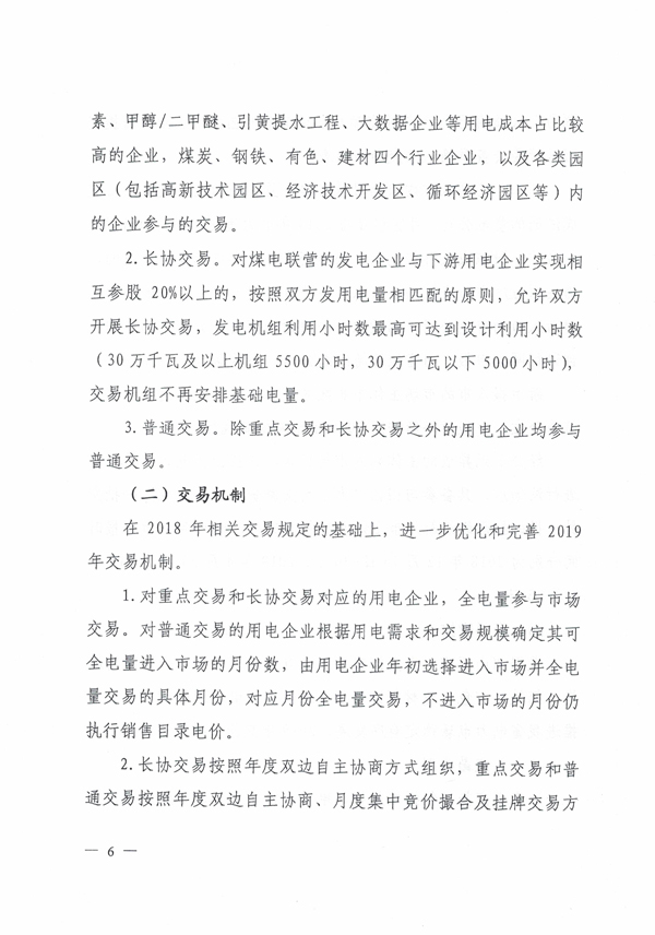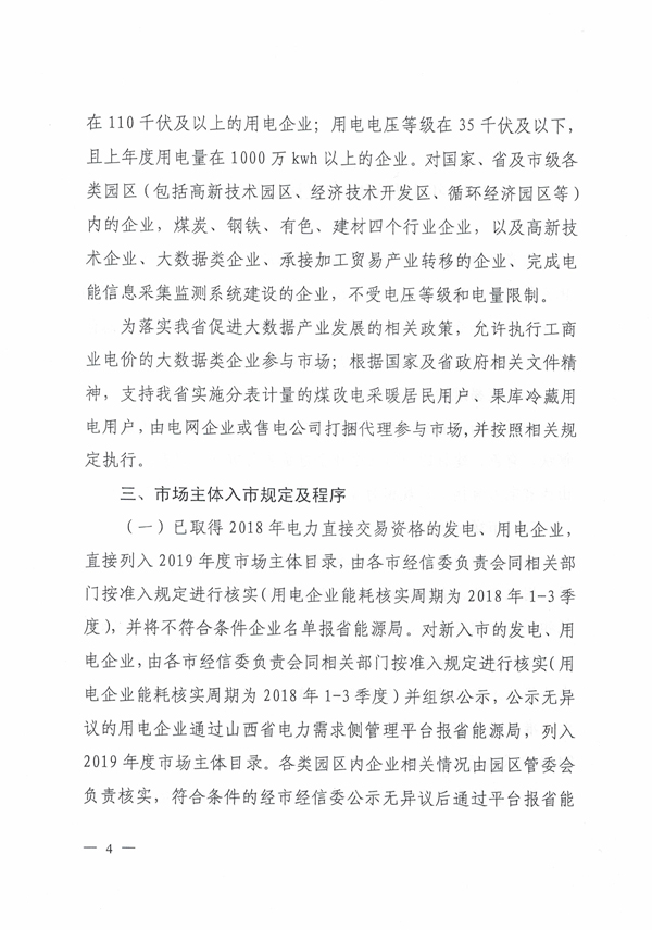 《方案》明確:進(jìn)一步放寬大工業(yè)用電企業(yè)參與市場(chǎng)的范圍:用電電壓等級(jí)在110千伏及以上的用電企業(yè);用電電壓等級(jí)在35千伏及以下且上年度用電量在1000萬kwh以上的企業(yè),對(duì)國家,省及市級(jí)各類園區(qū)(包括高新技術(shù)因區(qū)、經(jīng)濟(jì)技術(shù)開發(fā)區(qū)、循環(huán)經(jīng)濟(jì)園區(qū)等)內(nèi)的企業(yè),煤炭、鋼鐵、有色、建材四個(gè)行業(yè)企業(yè),以及高新技術(shù)企業(yè)、大數(shù)據(jù)類企業(yè)、承接加工貿(mào)易產(chǎn)業(yè)轉(zhuǎn)移的企業(yè),完成電能信息采集監(jiān)測(cè)系統(tǒng)建設(shè)的企業(yè),不受電壓等級(jí)和電量限制。