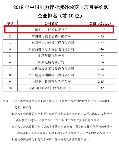 根據(jù)機(jī)電商會(huì)統(tǒng)計(jì),2018年,中國(guó)電力行業(yè)企業(yè)參與境外電力項(xiàng)目投(議)標(biāo)并最終實(shí)現(xiàn)簽約的項(xiàng)目399個(gè),簽約合同總金額466.8億美元,同比增長(zhǎng)5.8%,簽約發(fā)電裝機(jī)總?cè)萘?013.7萬千瓦。根據(jù)各重點(diǎn)企業(yè)報(bào)送的2018年境外電力項(xiàng)目的新簽約情況,機(jī)電商會(huì)對(duì)企業(yè)簽約額進(jìn)行了排名?,F(xiàn)將排名前50位的企業(yè)名單及各子行業(yè)簽約額排名前10位的企業(yè)名單予以發(fā)布。