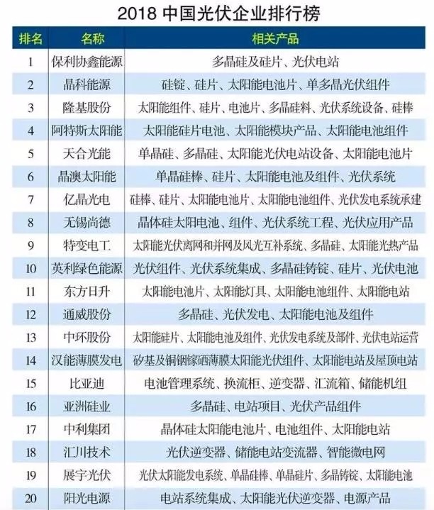 在2018年中國(guó)光伏企業(yè)排行榜中,前十名的光伏企業(yè)分別為保利協(xié)鑫能源、晶科能源、隆基股份、阿特斯太陽(yáng)能、天合光能、晶澳太陽(yáng)能、億晶光電、無(wú)錫尚德、特變電工、英利綠色能源。其涉及的主營(yíng)業(yè)務(wù)及產(chǎn)品如下表。本文則重點(diǎn)介紹在這些領(lǐng)先企業(yè)之外,在產(chǎn)業(yè)鏈各端占據(jù)絕對(duì)優(yōu)勢(shì)地位的“小巨頭”企業(yè)。