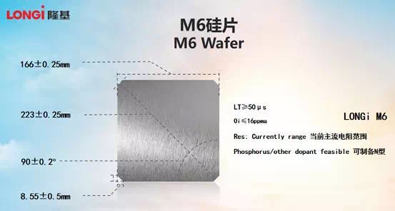 據(jù)隆基硅片事業(yè)部副總裁謝天介紹,M6硅片即166mm*166mm尺寸的大硅片,較M2(156.75mm)硅片面積提升了12.21%,對(duì)于電池、組件制造商而言,使用M6硅片能夠顯著提升組件輸出功率。