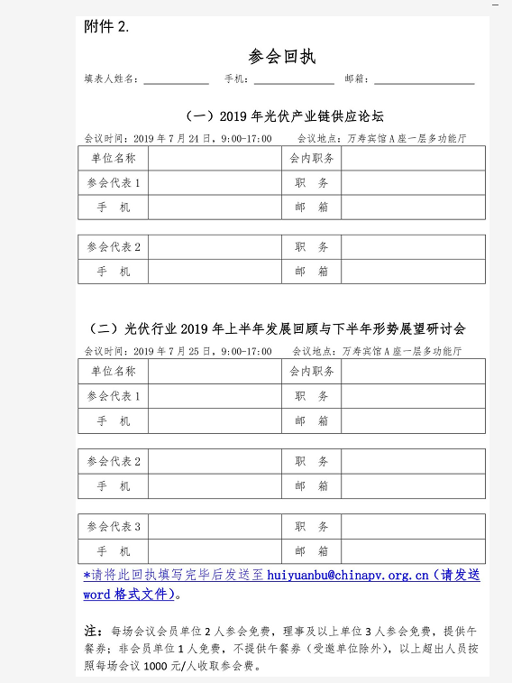 1、兩場會(huì)議單獨(dú)報(bào)名,請?zhí)顚憛?huì)回執(zhí)(見附件2),于2019年7月19日(星期五)下午17:00前反饋至中國光伏行業(yè)協(xié)會(huì)會(huì)員工作部郵箱huiyuanbu@chinapv.org.cn。會(huì)議不接受未提前報(bào)名人員參會(huì),會(huì)務(wù)組嚴(yán)格按照報(bào)名回執(zhí)表提供相應(yīng)資料、餐券等,如參會(huì)人員變化,請?zhí)崆芭c協(xié)會(huì)秘書處聯(lián)系。
