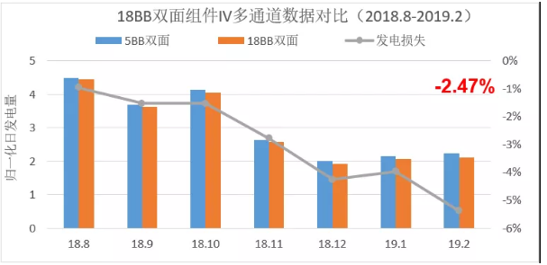 在7個月的發(fā)電測試中,18BB雙面組件較5BB雙面組件發(fā)電量低2.47%。
