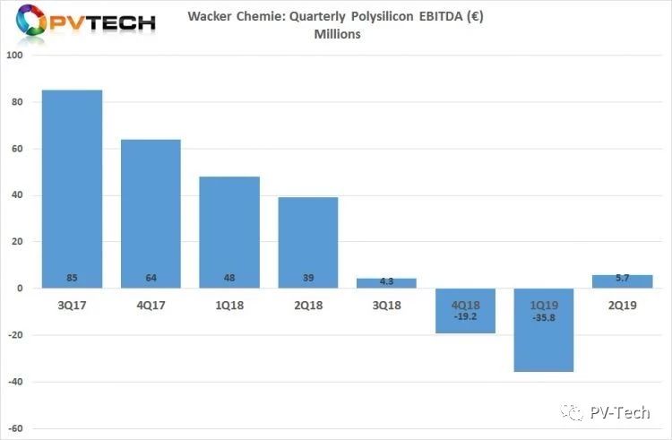 瓦克化學多晶硅部公布的2019年二季度收入為1.699億歐元,較去年同期下降30%。公司在季度報告中指出,下降的原因是由于“太陽能級多晶硅均價顯著下跌,年銷量的同比下降也給銷售造成了負擔。”