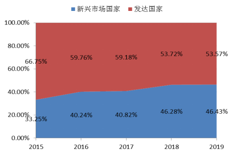 ▲2015-2019年 “500強(qiáng)”企業(yè)中新興市場(chǎng)國(guó)家與發(fā)達(dá)國(guó)家企業(yè)總營(yíng)業(yè)收入占比