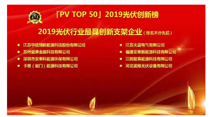 2019年11月27日,「PV TOP 50」2019光伏行業(yè)創(chuàng)新力企業(yè)50強(qiáng)榜單發(fā)布暨頒獎(jiǎng)典禮(PV TOP 50光伏創(chuàng)新榜)在蘇州圓滿落下帷幕!卡思能源受邀出席,并榮獲“「PV TOP 50」2019光伏創(chuàng)新榜最具創(chuàng)新支架企業(yè)”稱號(hào)。此次獲獎(jiǎng)是對(duì)卡思能源技術(shù)創(chuàng)新及產(chǎn)品研發(fā)能力的充分肯定。