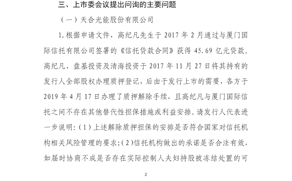 三、上市委會(huì)議提出問詢的主要問題(一)天合光能股份有限公司1.根據(jù)申請(qǐng)文件,高紀(jì)凡先生于 2017 年 2 月通過與廈門國(guó) 際信托有限公司簽署的《信托貸款合同》獲得 45.69 億元貸款。高紀(jì)凡、盤基投資及清海投資于 2017 年 11 月 27 日將其持有的 發(fā)行人全部股權(quán)辦理質(zhì)押登記,后由于發(fā)行上市的需要,各方于 2019 年 4 月 17 日辦理了質(zhì)押解除手續(xù),且高紀(jì)凡與廈門國(guó)際信 托之間不存在其他替代性擔(dān)保措施或利益安排。請(qǐng)發(fā)行人代表進(jìn) 一步說明:(1)上述解除質(zhì)押擔(dān)保的安排是否符合國(guó)家對(duì)信托機(jī) 構(gòu)相關(guān)風(fēng)險(xiǎn)管理的要求;(2)信托機(jī)構(gòu)做出的承諾是否合法有效, 如屆時(shí)協(xié)商不成是否存在實(shí)際控制人夫婦持股被凍結(jié)處置的可能性,如何保證對(duì)實(shí)際控制人的控股權(quán)不產(chǎn)生不利影響;(3)《信 托貸款合同》是否約定實(shí)際控制人在發(fā)生諸如違反借款用途等情 況下負(fù)有提前還款的責(zé)任;如存在,請(qǐng)說明如何保證其控股權(quán)不 受影響;(4)實(shí)際控制人的還款計(jì)劃及相關(guān)措施的可靠性。請(qǐng)保 薦代表人發(fā)表明確意見。