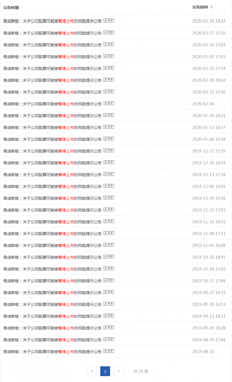 在2019年審計財報未正式公布之前,易成新能則必須每五個交易日發(fā)布一次公司股票可能被暫停上市的風(fēng)險提示公告。除非風(fēng)險解除,否則就要一直發(fā)布這樣尷尬的公告。