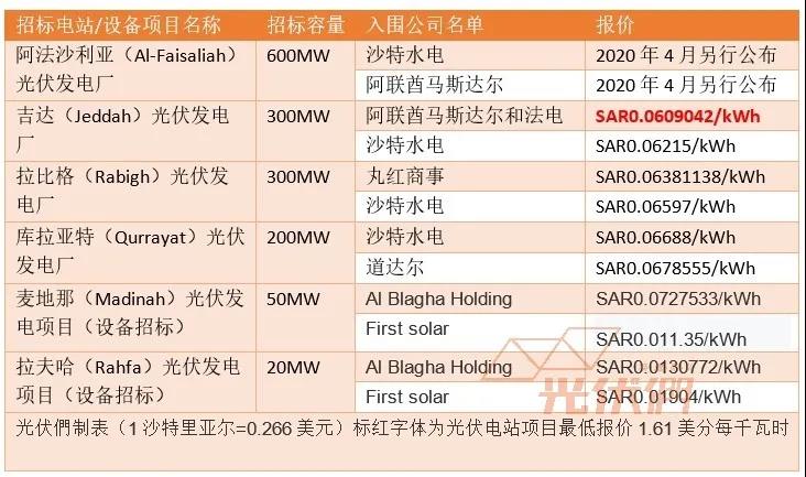 有兩個(gè)財(cái)團(tuán)入圍了300MW的吉達(dá)(Jeddah)發(fā)電項(xiàng)目,第一個(gè)財(cái)團(tuán)是阿聯(lián)酋馬斯達(dá)爾和法國(guó)電力公司(EDF),他們給出了SAR0.0609042/kWh度電成本(LCOE),第二個(gè)財(cái)團(tuán)由沙特水電牽頭,給出了SAR0.06215/kWh的報(bào)價(jià)。