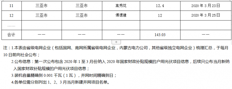 項(xiàng)目裝機(jī)容量統(tǒng)計(jì)表》、《海南省1月-3月納入2020年國家財(cái)政補(bǔ)貼規(guī)模戶用光伏項(xiàng)目名單》一并予以公告。
