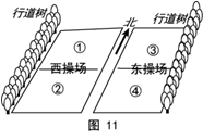 高考真題(2012年安徽卷) 圖11為我省平原地區(qū)某中學(xué)的操場(chǎng)和行道樹示意圖(晴天8:00前后,東操場(chǎng)大部分被行道樹的樹蔭覆蓋)。完成30-31題。