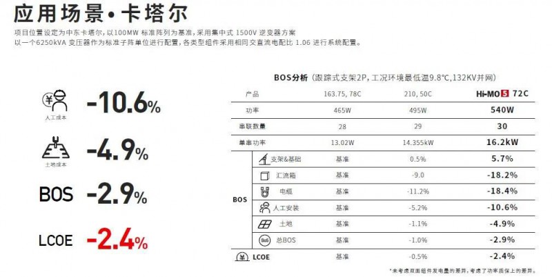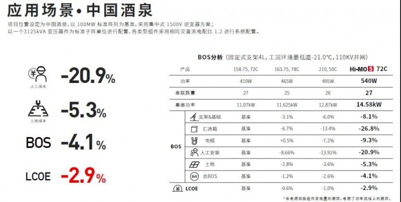 對于182mm,隆基推出的新品Hi-MO5,量產(chǎn)功率可以達到540W。據(jù)了解,從2019年底開始立項研究,歷時6個月研究,通過市場調(diào)研、長時間的驗證與謹慎的推理,反復推導,最終在今年四月定型。此前,隆基也已就該尺寸與同行企業(yè)進行了充分的溝通,從各家近期發(fā)布的新品來看,各家也在朝著一致的方向前進,更為重要的是,尺寸的統(tǒng)一也將給下游客戶帶來價值最大化。隆基182mm產(chǎn)品工作電流約13A,完美適配現(xiàn)有逆變器;疊加雙面技術(shù)后,工作電流仍控制在新一代逆變器的最大輸入電流范圍內(nèi),有效避免發(fā)電損失。72版型組件尺寸為2256×1133mm,重量為32.3kg。