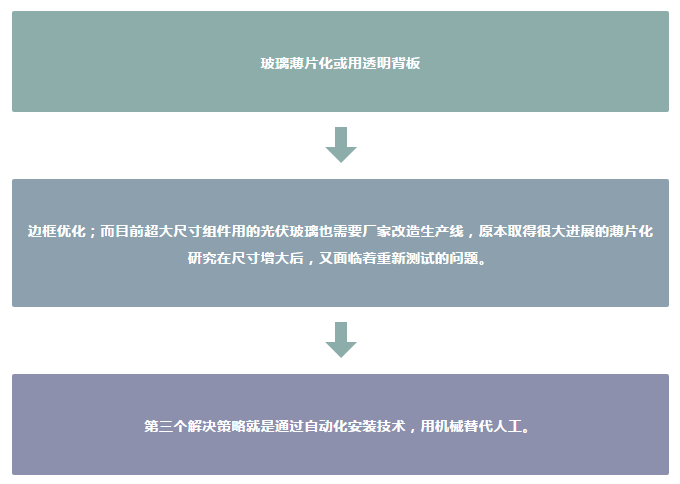 大組件可以節(jié)約土地,減少人工,但過大的組件尺寸也會對下游安裝帶來影響,尤其是雙面發(fā)電組件日漸成為主流,進一步加大組件重量。