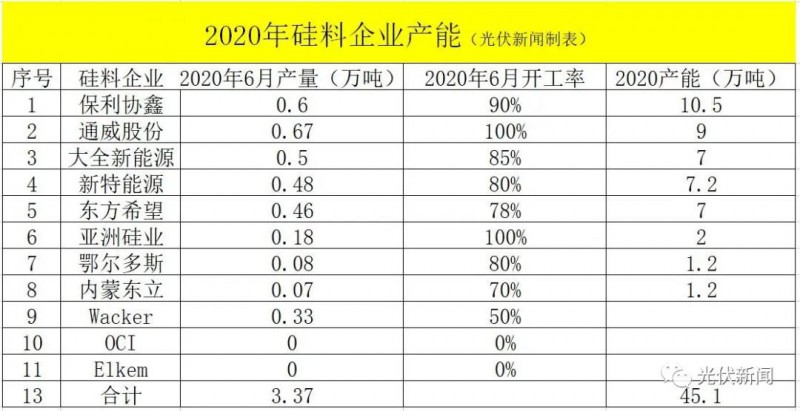 之前單晶致密料價(jià)格跌破60到58元/公斤,最低時(shí)鑄造多晶硅價(jià)格也到了26-27元/公斤,這個(gè)價(jià)格比一些多晶硅企業(yè)的現(xiàn)金成本還低,因此大部分多晶硅企業(yè)紛紛停產(chǎn)減產(chǎn)。小編對(duì)多晶硅企業(yè)2020年6月的產(chǎn)能與硅片企業(yè)6月的產(chǎn)能做了一個(gè)調(diào)研。2020年6月,全球多晶硅企業(yè)的實(shí)際產(chǎn)量在3.37萬噸左右,其中2.9萬噸單晶用料,0.47萬噸鑄錠用料。調(diào)研中還發(fā)現(xiàn),國內(nèi)多晶硅企業(yè)只有通威、亞洲硅業(yè)在滿產(chǎn),即便協(xié)鑫、大全、特變、東方希望都沒有滿產(chǎn),而國外多晶硅企業(yè)僅僅只有瓦克開了50%左右的產(chǎn)能,其余多晶硅巨頭如韓國OCI、馬來西亞OCI、挪威Elkem等都已經(jīng)停產(chǎn)。因此,即便國內(nèi)兩家多晶硅巨頭發(fā)生事故不能滿產(chǎn),只要其余多晶硅廠家滿產(chǎn),就可以馬上滿足硅片企業(yè)對(duì)多晶硅的需求。