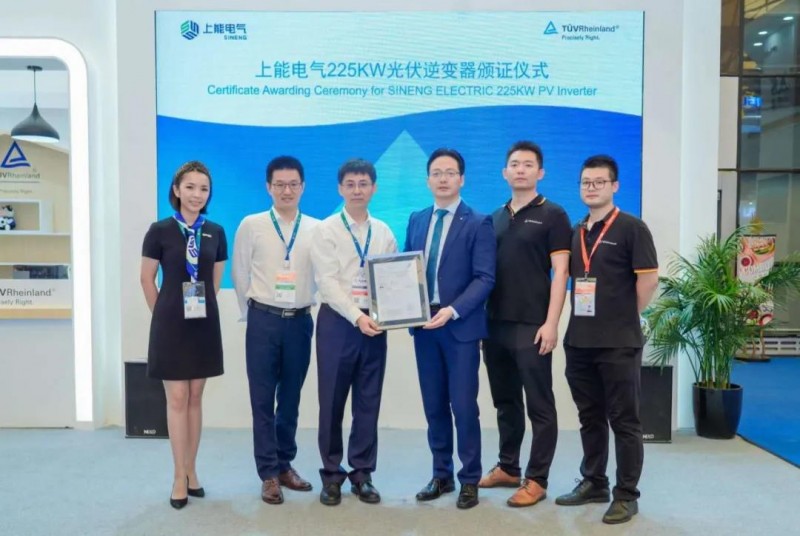 同期,全球領(lǐng)先的第三方檢測認(rèn)證機(jī)構(gòu)TUV萊茵為上能電氣熱銷型號SP-136K-H及最新型號SP-225K-H逆變器頒發(fā)TUV證書。TUV萊茵大中華區(qū)光伏與電子電氣總經(jīng)理李衛(wèi)春與上能電氣副總裁、首席技術(shù)官李建飛共同出席了頒證儀式。