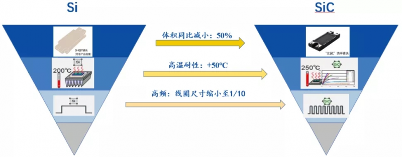 以碳化硅為代表的第三代半導體具備高禁帶寬度、高熱導率、高擊穿場強、高電子飽和漂移速率等優(yōu)勢,其耐高壓能力是硅的10倍、耐高溫能力是硅的2倍、高頻能力是硅的2倍??砷_發(fā)出更適應高溫、高功率、高壓、高頻以及抗輻射等惡劣條件的功率產品,可有效突破傳統(tǒng)硅基功率半導體器件及其材料的物理極限。