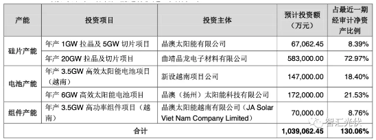 作為光伏一體化的龍頭企業(yè),晶澳科技反應(yīng)迅速,緊抓市場及政策機(jī)遇,不斷強(qiáng)化企業(yè)規(guī)模和成本優(yōu)勢,積極推進(jìn)擴(kuò)產(chǎn)進(jìn)程。硅片方面,擬在寧晉縣和“云南省水電硅材加工一體化產(chǎn)業(yè)示范基地”分別投資6.7億元和58.3億元建設(shè)拉晶車間、線切車間及倉儲動力等建筑、購置單晶爐、線切及其他附屬設(shè)備,投資建設(shè)“年產(chǎn)1GW拉晶及5GW切片項(xiàng)目”以及“年產(chǎn)20GW拉晶及切片項(xiàng)目”。電池產(chǎn)能方面,公司計(jì)劃投資14.7億元新設(shè)越南項(xiàng)目公司建設(shè)“年產(chǎn)3.5GW高效太陽能電池項(xiàng)目”,并在揚(yáng)州投資17.2億元新建廠房及相關(guān)配套設(shè)施,建設(shè)年化產(chǎn)能6GW高效晶硅電池生產(chǎn)線。組件方面,晶澳科技擬于越南利用現(xiàn)有土地,新建年產(chǎn)3.5GW高功率組件生產(chǎn)線及配套設(shè)施,建設(shè)“年產(chǎn)3.5GW高功率組件項(xiàng)目”,該項(xiàng)目總投資7億元。