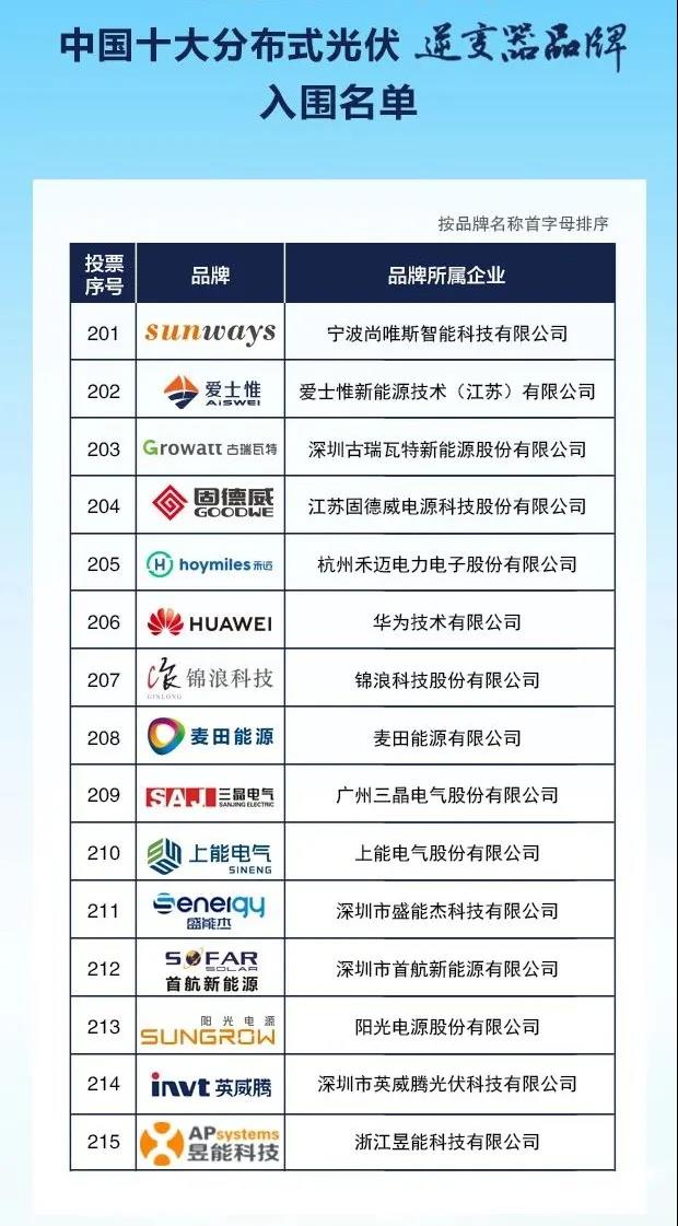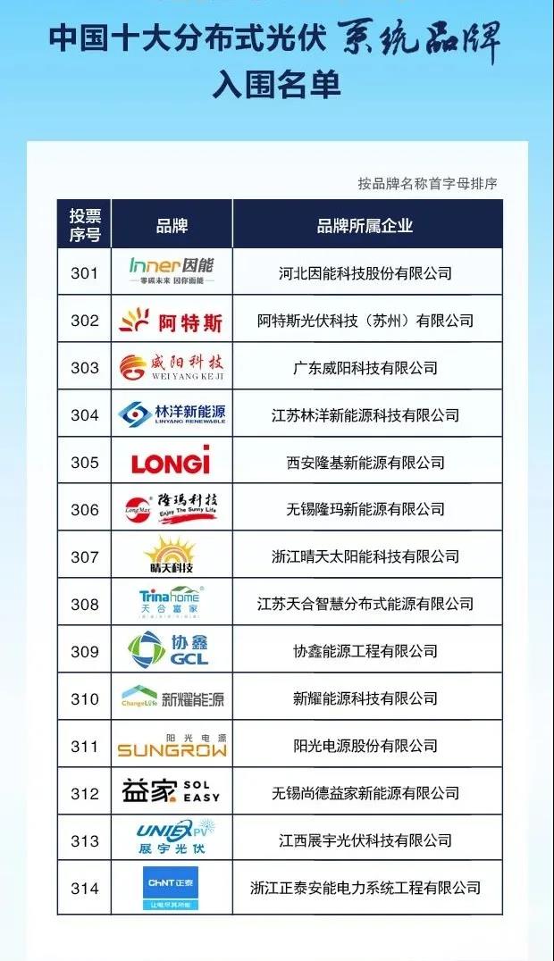 中國十大分布式光伏品牌評(píng)選自報(bào)名以來,吸引了協(xié)鑫、尚德、隆基、日托、晶科、華為、陽光電源、愛士惟、固德威、首航、益家soleasy、天合智慧、正泰安能、展宇、中設(shè)國聯(lián)、林洋、麥田能源、優(yōu)得運(yùn)維、英臻科技等眾多分布式光伏品牌企業(yè)積極報(bào)名參加。經(jīng)后續(xù)資格審核,共57個(gè)品牌入圍評(píng)選?,F(xiàn)將入圍名單公布如下: