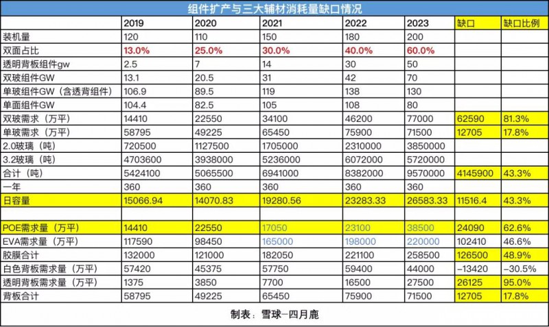 1)2021年起,雙玻組件采用一面eva一面poe計(jì)算,透背組件2021年開始全部按雙面eva算。