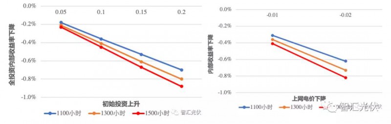 投資每增加0.05元/W,全投資內(nèi)部收益率大概會下降0.2%左右;增加0.2元/W,全投資內(nèi)部收益率大概會下降0.8%左右;上網(wǎng)電價每下降0.01元/kWh,全投資內(nèi)部收益率大概會下降0.35%左右;下降0.02元/kWh,全投資內(nèi)部收益率大概會下降0.6%~0.8%。