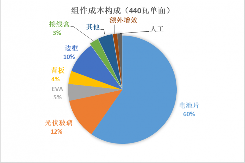 供求錯(cuò)位讓玻璃的價(jià)格水漲船高,從三季度以來,光伏玻璃的市場報(bào)價(jià)一路走高,截至目前市場上已經(jīng)出現(xiàn)了45元/平的報(bào)價(jià),與之對應(yīng)的是,組件企業(yè)面臨巨大的成本壓力。原本在光伏玻璃在整個(gè)組件成本中占比約為10%,隨著價(jià)格的水漲船高,在440瓦單面組件成本構(gòu)成中,玻璃占比已經(jīng)超過12%,而在雙面雙玻組件中這一比例還會更高。