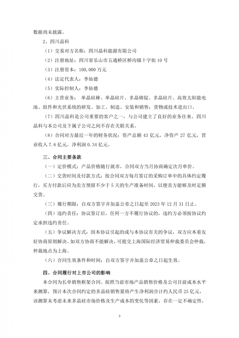 今日,通威股份發(fā)布公告稱,跟晶科能源簽訂大額銷售框架合同,合同約定 2020 年 11 月-2023 年 12 月期間,晶科能源及其子公司四川晶科向通威股份下屬永祥多晶硅、永祥新能源、內(nèi)蒙通威、云南通威合計采購多晶硅 9.3 萬噸。同時表示,合同鎖量不鎖價,產(chǎn)品價格隨行就市,交易總額已最終成交金額為準。