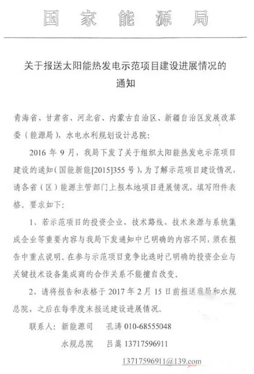 近日,國(guó)家能源局發(fā)布《關(guān)于報(bào)送太陽(yáng)能熱發(fā)電示范項(xiàng)目建設(shè)進(jìn)展情況的通知》(以下簡(jiǎn)稱“通知”)。為了解示范項(xiàng)目建設(shè)情況,各省區(qū)能源主管部門須上報(bào)本地項(xiàng)目進(jìn)展情況。