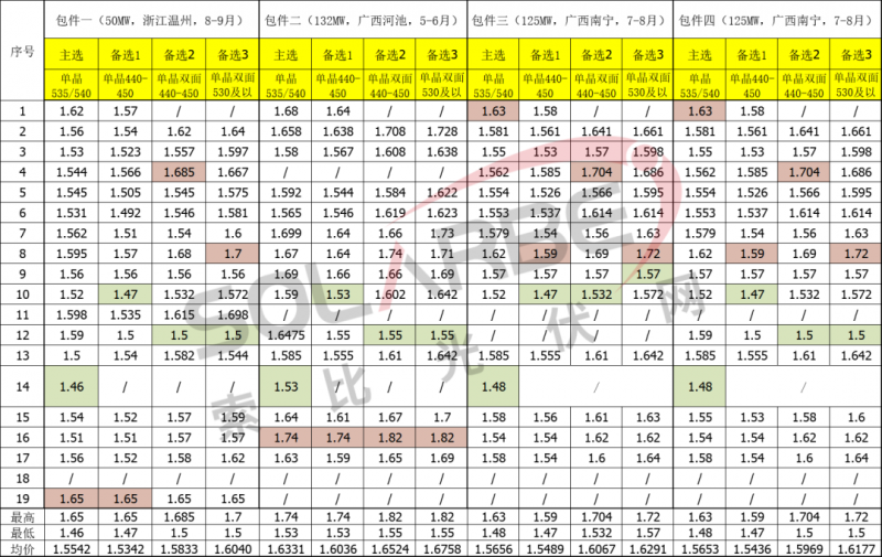 本次招標(biāo)采用“主選型號+3備選型號”的方式分別報價。從功率看,多數(shù)包件的主選型號為535-540W單晶組件,以445-450W單晶組件為備選,包件7-9反之。單、雙面來看,多數(shù)項目以單面組件作為主選產(chǎn)品,只有新疆的包件5、6以雙面發(fā)電組件為首選。