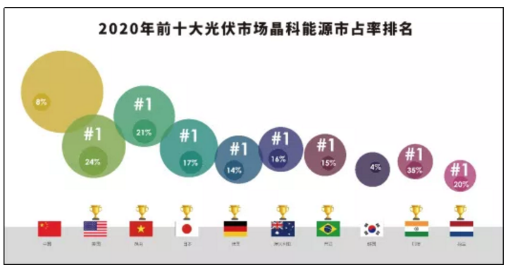 晶科太陽能是全球最大、最先進(jìn)的太陽能電池板制造商之一,占據(jù)全球12.6%的市場份額2020年全球裝機(jī)量預(yù)計在120GW左右,其中80%來自于前十大光伏國家,晶科在包括越南在內(nèi)的其中8個國家的市占率排名第一,越南市場市占率21%。
