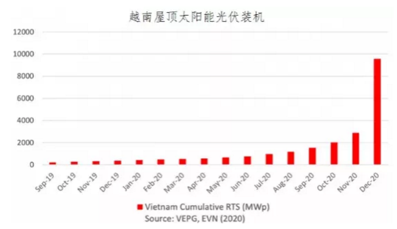 2020年底,越南累計光伏裝機(jī)已達(dá)到16.5GW,新增光伏裝機(jī)10.5GW,成為全球第三大光伏市場(中國市場48.2GW,美國市場19GW)。其中越南屋頂太陽能安裝量爆炸式猛增,全年新增屋頂光伏裝機(jī)超過9GW,10.2萬戶,裝機(jī)量增長了2435%。