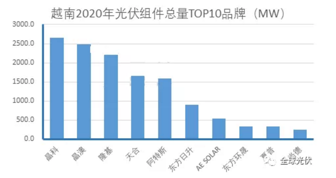 2020全年,在越南流通光伏組件品牌以全球知名光伏組件品牌為主,TOP10企業(yè)占越南全年組件進(jìn)口總量的88%。其中,晶科、晶澳、隆基、天合、阿特斯位列越南全年進(jìn)口光伏組件總量TOP5。天合、晶澳、阿特斯均在越南建有工廠。