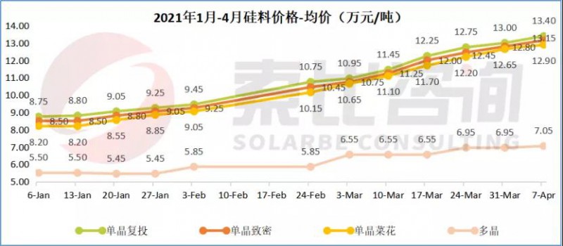 單晶致密均價(jià)13.15萬元/噸,環(huán)比上漲2.73%,最高成交價(jià)13.50萬元/噸;