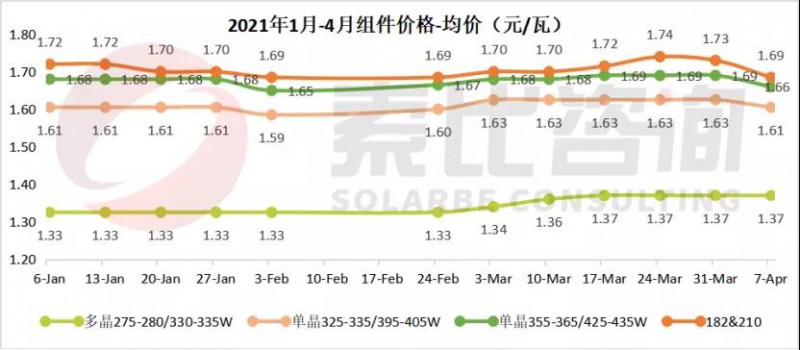 182mm組件和210mm組件,均價(jià)1.69元/瓦,環(huán)比下降2.60%,最高成交價(jià)1.75元/瓦。