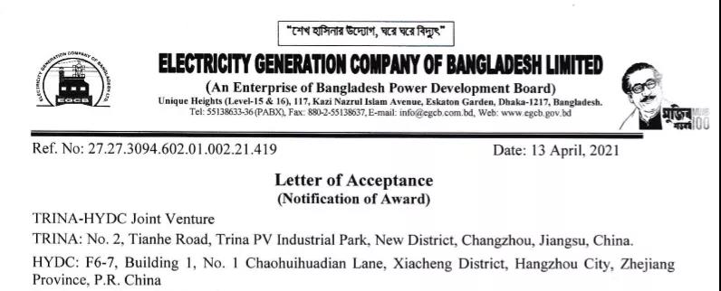 4月13日,孟加拉國營發(fā)電公司(EGCB)發(fā)布So