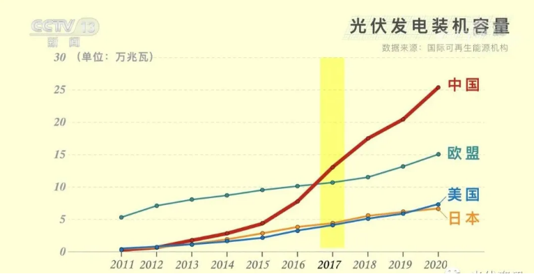 當(dāng)放眼全國(guó),中科院空天院利用衛(wèi)星遙感影像,為我們精準(zhǔn)提取出了光伏基地的分布情況。地圖上的每一個(gè)亮點(diǎn),就代表一個(gè)光伏集中發(fā)電區(qū),截至2019年,這樣的區(qū)域就有2600多個(gè)。這讓我國(guó)光伏發(fā)電的裝機(jī)容量迅速增長(zhǎng)。2011年,中國(guó)的裝機(jī)容量?jī)H為日本、美國(guó)的六成,為歐盟的6%。從2013年起,國(guó)家加大節(jié)能減排力度,光伏產(chǎn)業(yè)快速發(fā)展。到2017年,中國(guó)的裝機(jī)容量就超過(guò)了整個(gè)歐盟的總和。