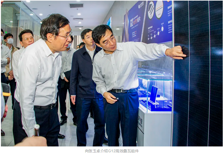 沈浩平向張玉卓一行介紹了中環(huán)股份在光伏產(chǎn)業(yè)的發(fā)展成果與未來(lái)規(guī)劃。中環(huán)股份作為中國(guó)最早從事光伏產(chǎn)業(yè)的企業(yè)之一,對(duì)產(chǎn)業(yè)發(fā)展方向及自身發(fā)展路徑有著清晰的認(rèn)知。公司通過(guò)G12光伏硅片、高效疊瓦組件兩大技術(shù)平臺(tái),結(jié)合工業(yè)4.0生產(chǎn)制造模式,以客戶為中心,市場(chǎng)為導(dǎo)向,持續(xù)引領(lǐng)光伏產(chǎn)業(yè)降本增效。沈浩平表示,雙方的業(yè)務(wù)發(fā)展方向具有良好的互補(bǔ)性,希望能與中國(guó)石化一道,共同推動(dòng)能源產(chǎn)業(yè)綠色發(fā)展,為實(shí)現(xiàn)“碳達(dá)峰”、“碳中和”目標(biāo)貢獻(xiàn)力量。