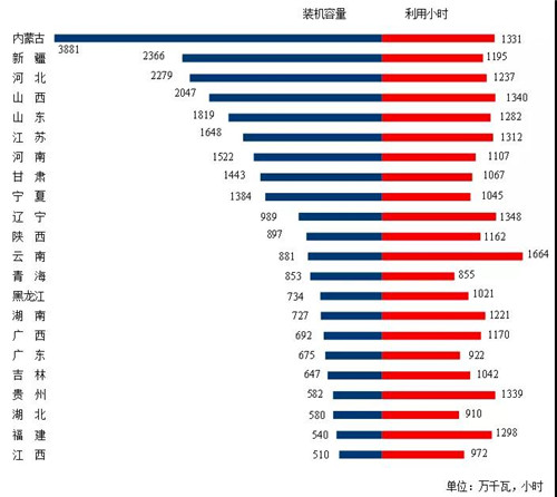 圖3 1-6月份風(fēng)電裝機(jī)較多省份風(fēng)電裝機(jī)容量和設(shè)備利用小時