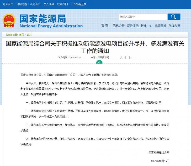 今年以來(lái),我國(guó)電力、煤炭消費(fèi)較快增長(zhǎng),電力供需持續(xù)偏緊。加快風(fēng)電、光伏發(fā)電項(xiàng)目建設(shè)并網(wǎng),增加清潔電力供應(yīng),既有利于緩解電力供需緊張形勢(shì),也有利于助力完成能耗雙控目標(biāo),促進(jìn)能源低碳轉(zhuǎn)型。為進(jìn)一步做好2021年度新能源發(fā)電項(xiàng)目并網(wǎng)接入工作,現(xiàn)將有關(guān)事項(xiàng)明確如下。