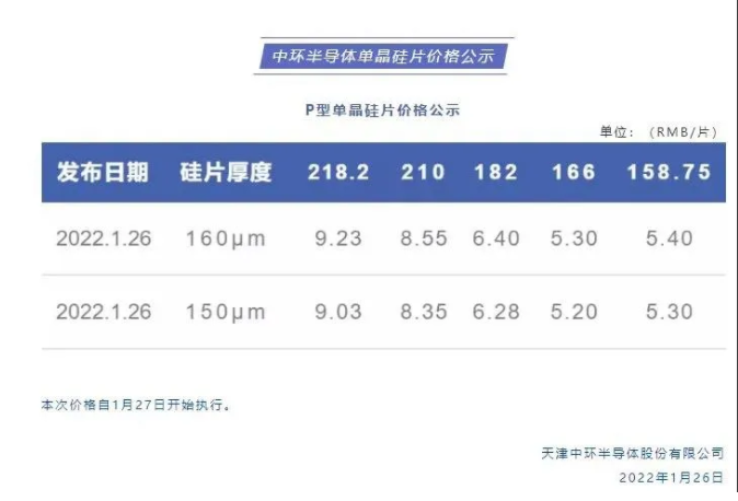 1月26日,中環(huán)股份在公眾號上發(fā)布了最新的硅片價格,與上次價格相比,本次價格對150μm、160μm進行了全面上調(diào)。以160μm為例,不同規(guī)格的硅片價格上調(diào)0.4~0.92元/片。價格調(diào)整將于1月27日開始執(zhí)行。