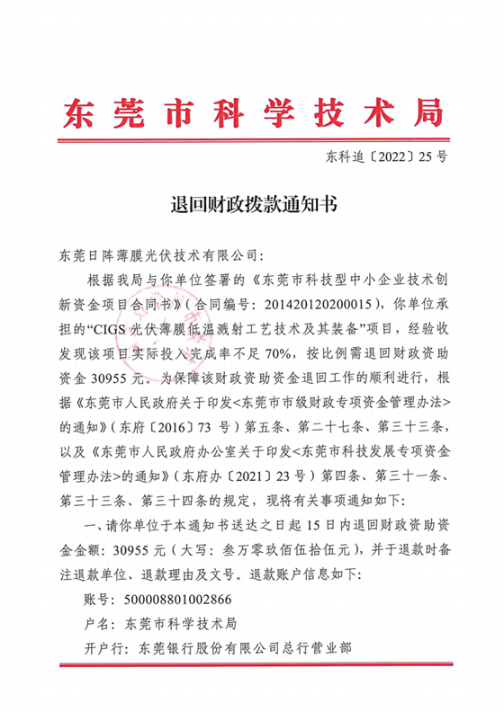 天眼查資料顯示,東莞日陣薄膜光伏技術(shù)有限公司成立于2010年12月24日,注冊(cè)資本為100萬美元,經(jīng)營范圍包括生產(chǎn)和銷售薄膜光伏模塊,薄膜生產(chǎn)設(shè)備,并提供售后服務(wù)及相關(guān)咨詢服務(wù);設(shè)立研發(fā)機(jī)構(gòu),研究和開發(fā)薄膜光伏生產(chǎn)技術(shù)、薄膜生產(chǎn)設(shè)備。目前,該公司經(jīng)營狀態(tài)為吊銷,未注銷。