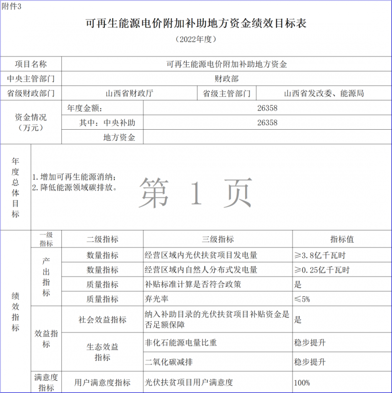根據(jù)財(cái)政部會(huì)同有關(guān)部門(mén)印發(fā)的《關(guān)于印發(fā)<可再生能源電價(jià)附加資金管理辦法>的通知》(財(cái)建〔2020〕5號(hào),以下簡(jiǎn)稱(chēng)《資金管理辦法》)、《關(guān)于<關(guān)于促進(jìn)非水可再生能源發(fā)電健康發(fā)展的若干意見(jiàn)>有關(guān)事項(xiàng)的補(bǔ)充通知》(財(cái)建〔2020〕426號(hào))等文件要求以及你單位申請(qǐng),現(xiàn)下達(dá)2022年度可再生能源電價(jià)附加補(bǔ)助資金預(yù)算。資金支付方式按照財(cái)政國(guó)庫(kù)集中支付有關(guān)制度執(zhí)行,具體金額見(jiàn)附件2。項(xiàng)目代碼和名稱(chēng)為“Z175060070001可再生能源電價(jià)附加補(bǔ)助地方資金”,支出列2022年政府收支分類(lèi)科目:“2116001風(fēng)力發(fā)電補(bǔ)助”、“2116002太陽(yáng)能發(fā)電補(bǔ)助”、“2116003生物質(zhì)能發(fā)電補(bǔ)助”。列政府預(yù)算支出經(jīng)濟(jì)分類(lèi)科目“50799其他對(duì)企業(yè)補(bǔ)助”。有關(guān)事項(xiàng)通知如下: