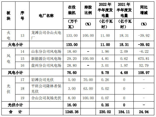 截至2022年6月30日,廣西桂冠電力股份有限公司直屬及控股公司電廠累計完成發(fā)電量230.02億千瓦時,同比增加24.94%。其中:水電208.89億千瓦時,同比增加29.65%;火電11.00億千瓦時,同比減少39.92%;風電9.78億千瓦時,同比增加108.97%;光伏0.35億千瓦時。現(xiàn)將公司直屬及控股公司各電廠2022年上半年發(fā)電量完成情況公告如下: